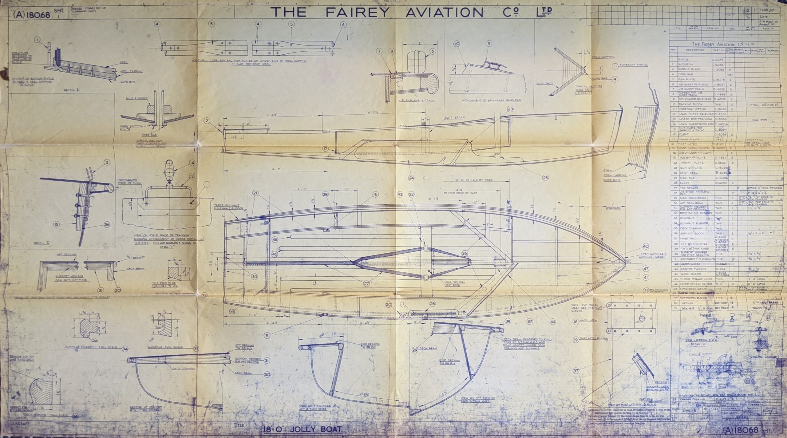 The drawing for the general arrangement of the standard Fairey completed Jollyboat of the 1950’s and early 60’s is below, as a guide. Many Jollyboats were completed by other builders from hull’s supplied by Fairey’s, and buoyancy apparatus varies, between built in tanks and bags.